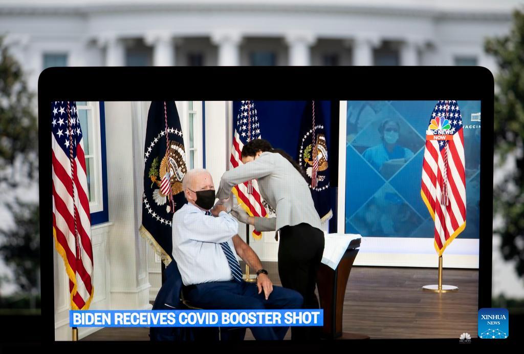 U.S. President Joe Biden is seen on a screen as he receives his COVID-19 vaccine booster shot in Washington, D.C., the United States, on Sept. 27, 2021. Biden on Monday received his COVID-19 vaccine booster shot on camera at the White House. (Xinhua/Liu Jie)