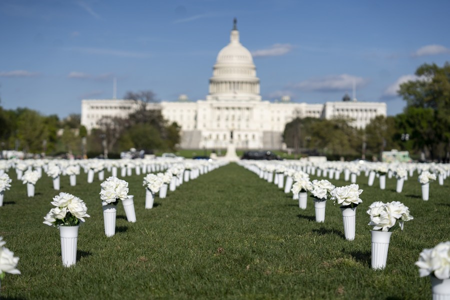 Photo taken on April 13, 2021 shows 40,000 white silk flowers installed on the National Mall to honor the nearly 40,000 Americans who die every year from gun violence in Washington, D.C., the United States. (Xinhua/Liu Jie)