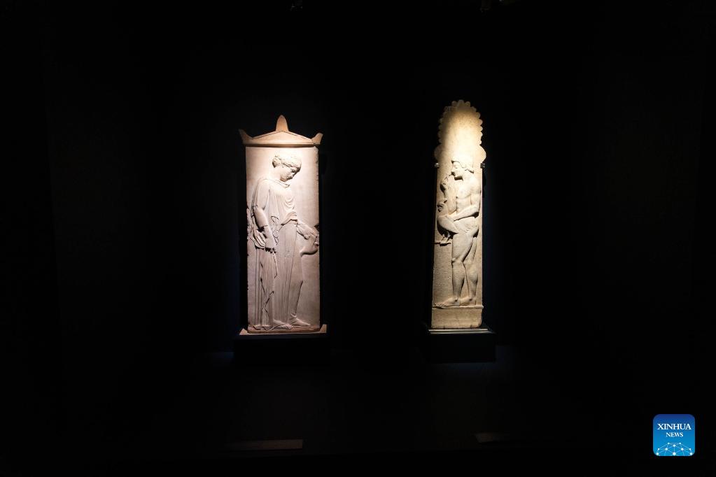 Marble grave stelae are on display during a preview of the exhibition "Kallos, The Ultimate Beauty" at the Museum of Cycladic Art in Athens, Greece, on Sept. 27, 2021. A new exhibition by the Museum of Cycladic Art in Athens invites visitors to reflect on their personal notion of ultimate beauty by taking them on a time-travel in ancient Greece. Through 300 antiquities gathered from 52 museums, Ephorates of Antiquities and collections in Greece, Italy and the Vatican, the exhibition entitled "Kallos, The Ultimate Beauty," presents what this concept meant in everyday life and the philosophical discourse in ancient Greece, the organizers told a press conference on Monday. (Xinhua/Marios Lolos)