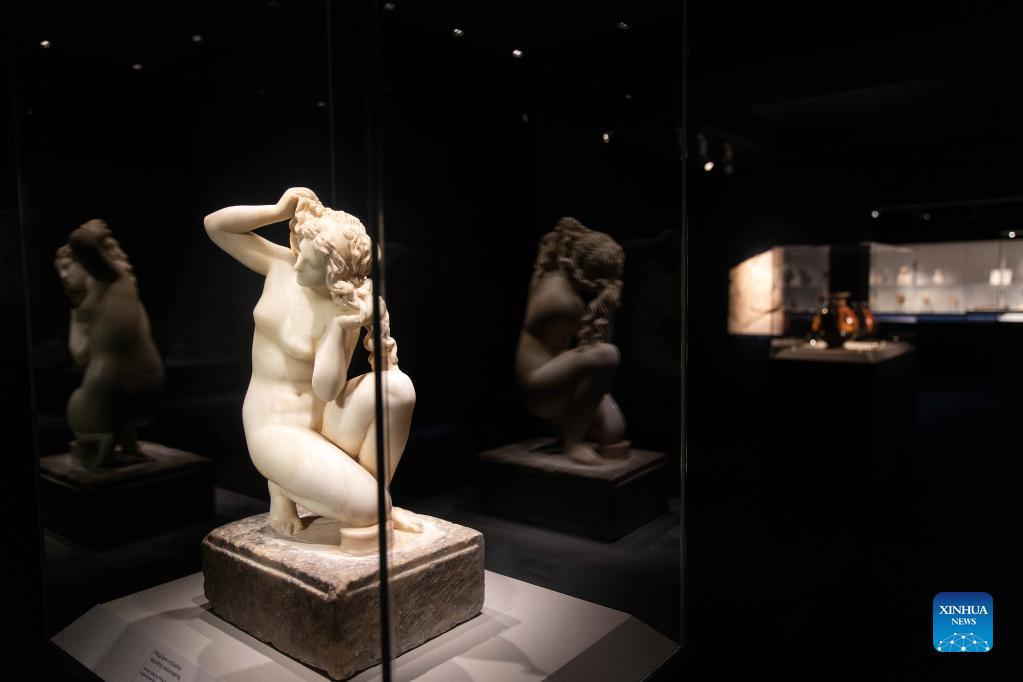 A marble statuette of Aphrodite after her bath is seen during a preview of the exhibition "Kallos, The Ultimate Beauty" at the Museum of Cycladic Art in Athens, Greece, on Sept. 27, 2021. A new exhibition by the Museum of Cycladic Art in Athens invites visitors to reflect on their personal notion of ultimate beauty by taking them on a time-travel in ancient Greece. Through 300 antiquities gathered from 52 museums, Ephorates of Antiquities and collections in Greece, Italy and the Vatican, the exhibition entitled "Kallos, The Ultimate Beauty," presents what this concept meant in everyday life and the philosophical discourse in ancient Greece, the organizers told a press conference on Monday. (Xinhua/Marios Lolos)