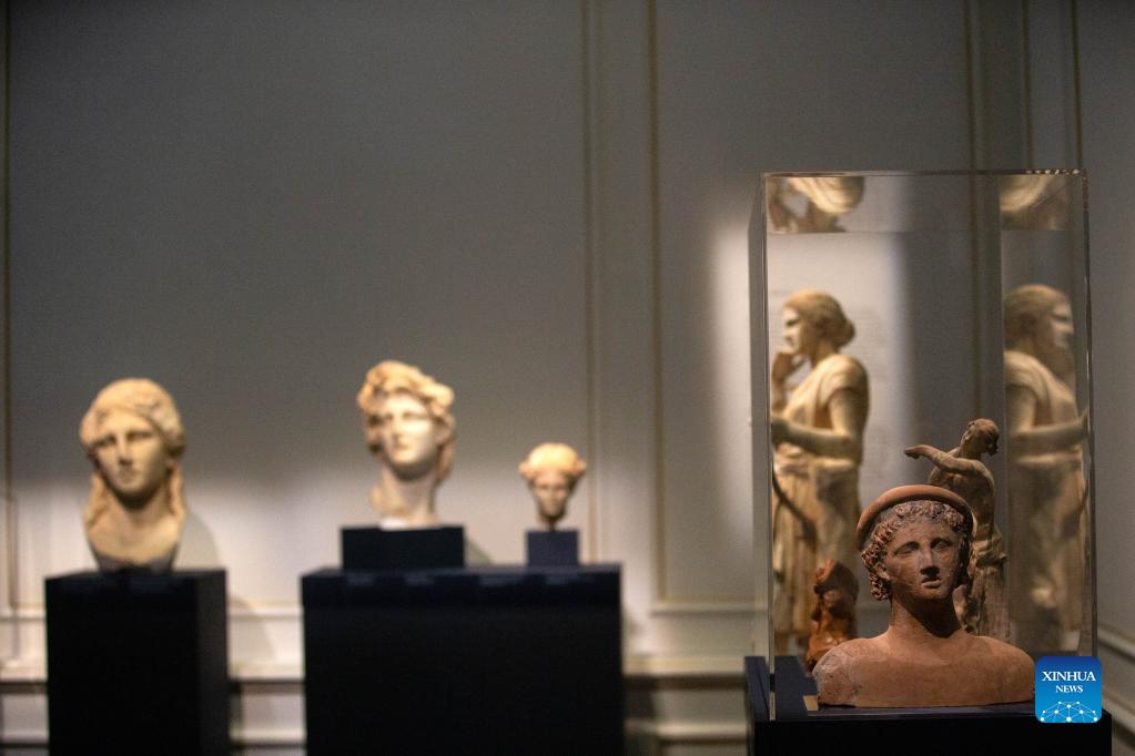 Antiquities are seen during a preview of the exhibition "Kallos, The Ultimate Beauty" at the Museum of Cycladic Art in Athens, Greece, on Sept. 27, 2021. A new exhibition by the Museum of Cycladic Art in Athens invites visitors to reflect on their personal notion of ultimate beauty by taking them on a time-travel in ancient Greece. Through 300 antiquities gathered from 52 museums, Ephorates of Antiquities and collections in Greece, Italy and the Vatican, the exhibition entitled "Kallos, The Ultimate Beauty," presents what this concept meant in everyday life and the philosophical discourse in ancient Greece, the organizers told a press conference on Monday. (Xinhua/Marios Lolos)