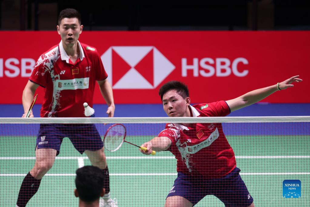China's Zhou Haodong (R)/Liu Cheng compete against India's M.R. Arjun and Dhruv Kapila in the mens' doubles competition during the group A match between China and India at Badminton Surdiman Cup 2021 in Vantaa, Finland, Sept. 27, 2021. (Photo by Matti Matikainen/Xinhua)