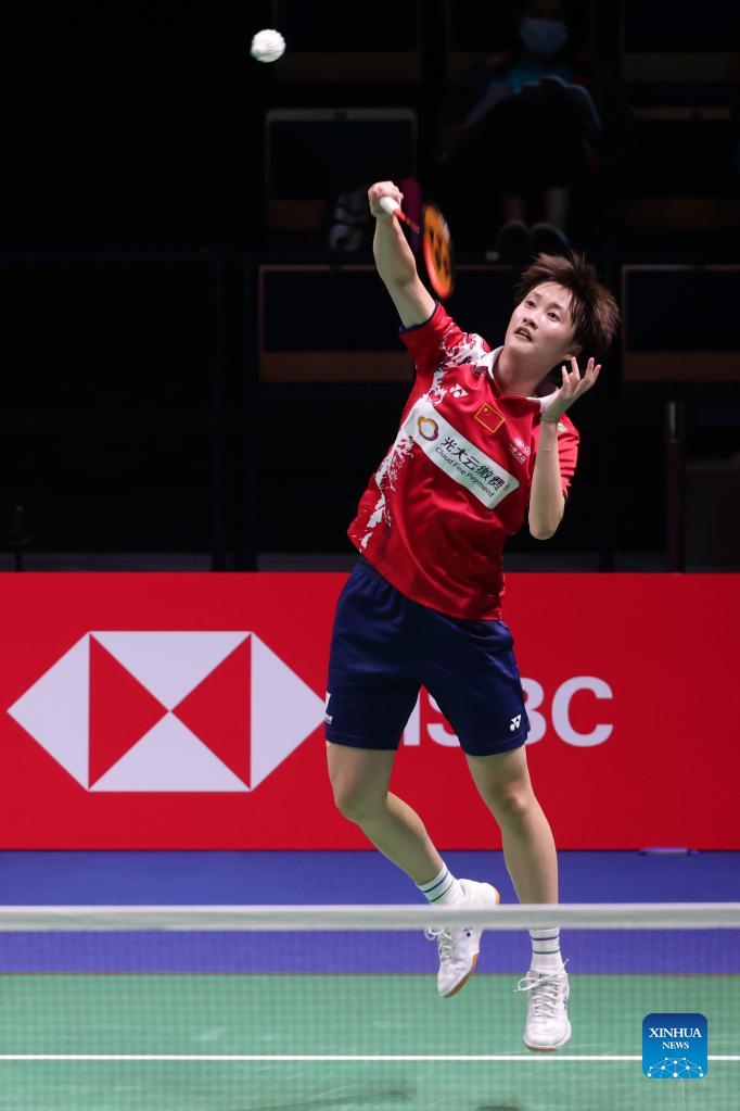 China's Chen Yufei competes against India's Aditi Bhatt in the women's singles competition during the group A match between China and India at Badminton Surdiman Cup 2021 in Vantaa, Finland, Sept. 27, 2021. (Photo by Matti Matikainen/Xinhua)