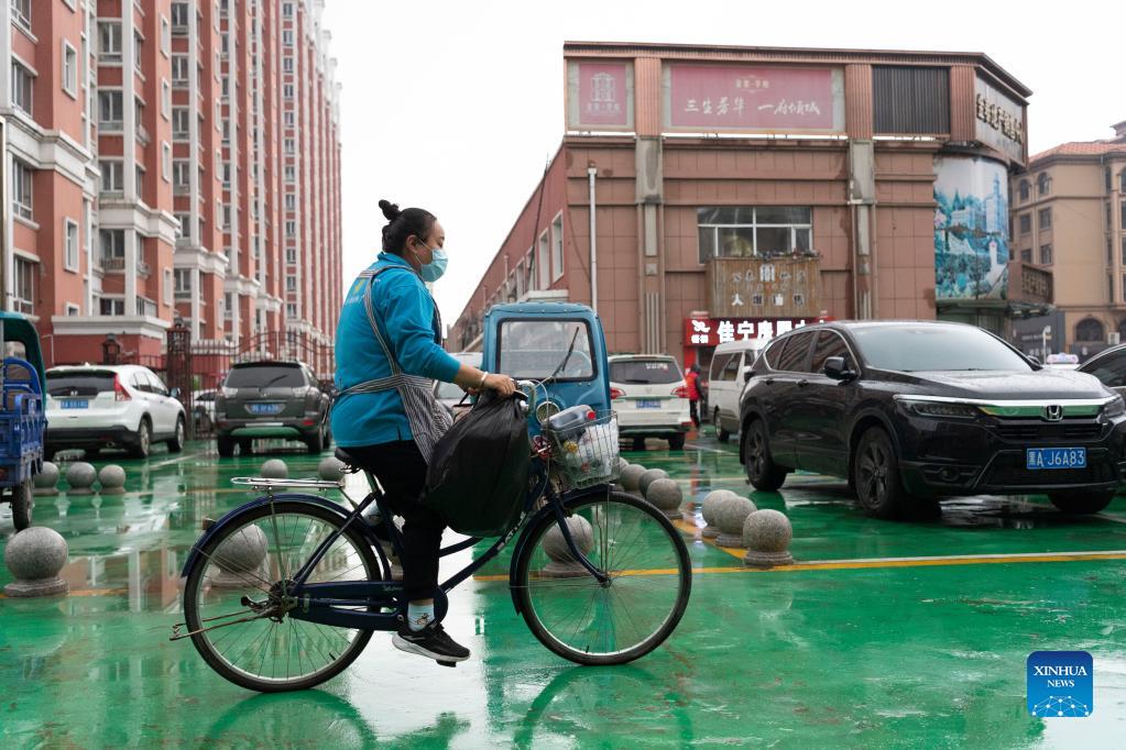 A supermarket employee delivers daily necessities to residents under close-off management in Bayan County, Harbin of northeast China's Heilongjiang Province, Sept. 27, 2021. The province on Sunday reported 11 new locally transmitted confirmed COVID-19 cases and three new local asymptomatic carriers. (Xinhua/Xie Jianfei)