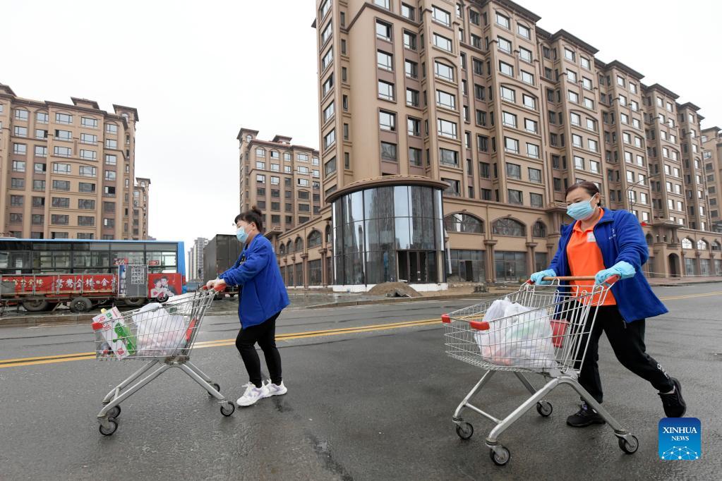 Supermarket employees deliver daily necessities to residents under close-off management in Bayan County, Harbin of northeast China's Heilongjiang Province, Sept. 27, 2021. The province on Sunday reported 11 new locally transmitted confirmed COVID-19 cases and three new local asymptomatic carriers. (Xinhua/Wang Jianwei)
