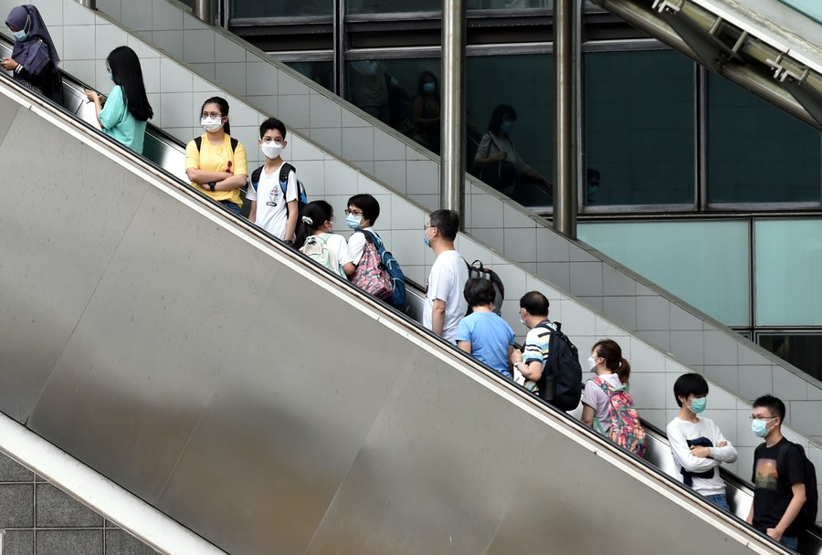 People take an escalator in Hong Kong, south China, April 1, 2021. (Xinhua/Lo Ping Fai)