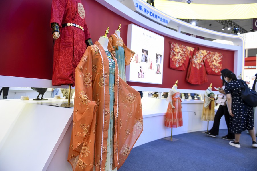 Visitors learn about Han-style costumes at the 17th China (Shenzhen) International Cultural Industries Fair (ICIF) in Shenzhen, south China's Guangdong Province, Sept. 23, 2021. (Xinhua/Mao Siqian)