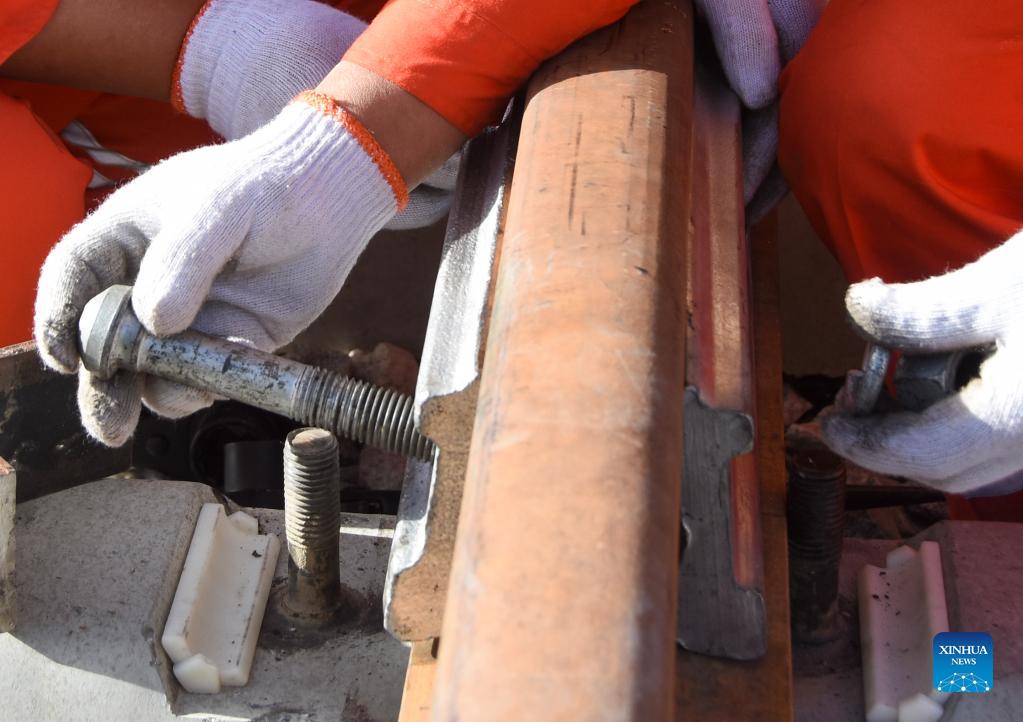 Workers tighten the screw of the rail for the Hotan-Ruoqiang Railway in northwest China's Xinjiang Uygur Autonomous Region, Sept. 27, 2021. The track-laying work for the Hotan-Ruoqiang Railway, the final section of the Taklimakan Desert railway loop line, was completed on Monday morning in Xinjiang's Minfeng County. Construction on the Hotan-Ruoqiang Railway started in December 2018. As a key national railway project extending over 825 km, it links up Hotan City in Hotan Prefecture with Ruoqiang County in Bayingolin Mongolian Autonomous Prefecture. The Hotan-Ruoqiang Railway is expected to open in June 2022. (Xinhua/Gu Yu)