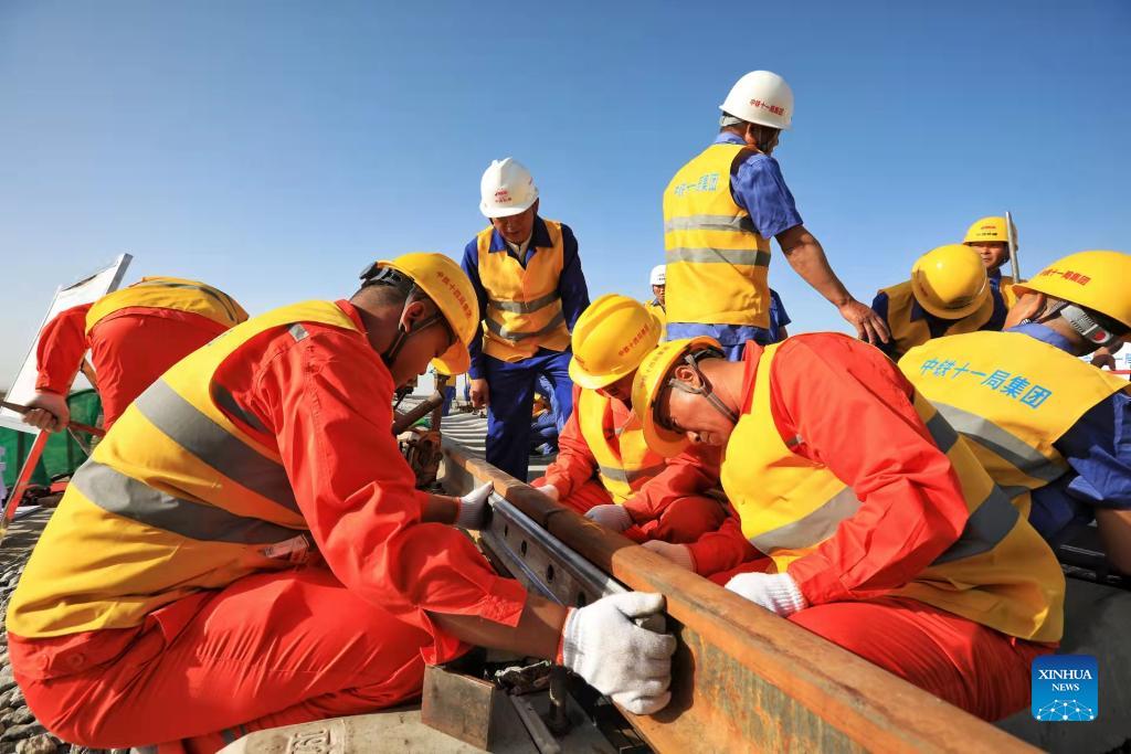 Workers join the ends of two rails together as part of the track-laying work for the Hotan-Ruoqiang Railway in northwest China's Xinjiang Uygur Autonomous Region, Sept. 27, 2021. The track-laying work for the Hotan-Ruoqiang Railway, the final section of the Taklimakan Desert railway loop line, was completed on Monday morning in Xinjiang's Minfeng County. Construction on the Hotan-Ruoqiang Railway started in December 2018. As a key national railway project extending over 825 km, it links up Hotan City in Hotan Prefecture with Ruoqiang County in Bayingolin Mongolian Autonomous Prefecture. The Hotan-Ruoqiang Railway is expected to open in June 2022. (Photo by Mu Zhipeng/Xinhua)