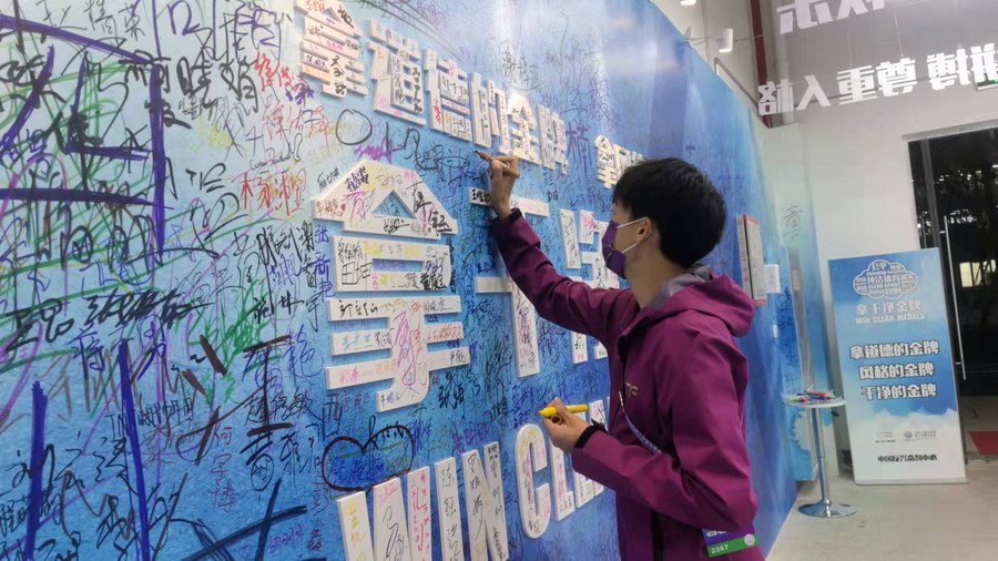 Hebei sprinter Wu Qiquan signs on the signature wall at the entrance of an anti-doping outreach booth in Athletes' Village during China's National Games on Sept. 20. (Xinhua)