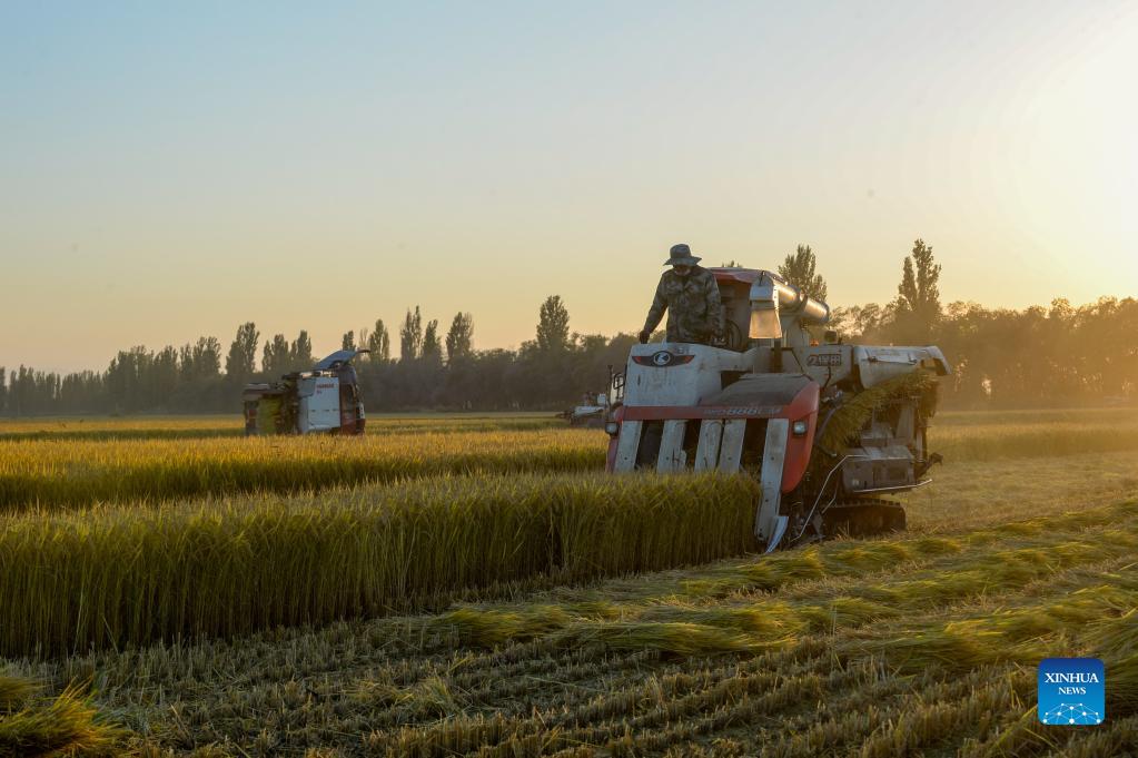 Members of the of the Xinjiang Production and Construction Corps operate harvesters in paddy fields in Kekedala City, northwest China's Xinjiang Uygur Autonomous Region, Sept. 26, 2021. (Xinhua/Gao Han)