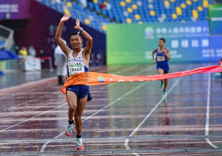 Renqingdongzhibu of Qinghai crosses the finishing line first in the men's marathon at the National Games in Xi'an, Shaanxi Province on September 26, 2021. (Xinhua/Wang Xi)
