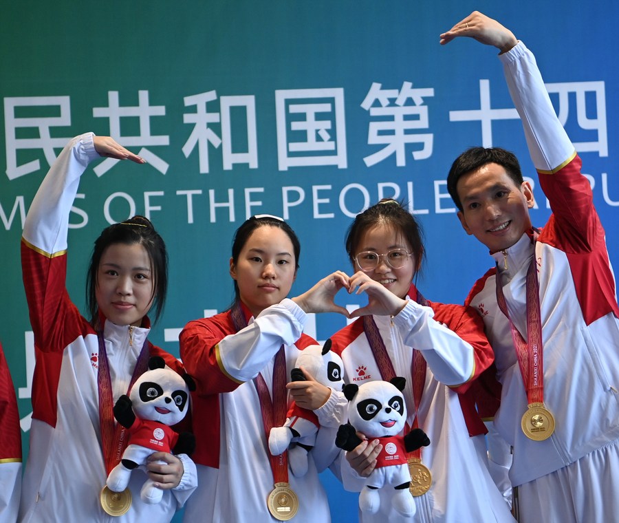 Zhejiang's Yang Qian (L1), Wang ZhiLin (L2), Han Jiayu (R2) and coach Ge Hongzhuan present at the medal ceremony after winning the women's 10m air rifle team final at the National Games on September 18, 2021. (Xinhua/Sun Fei)