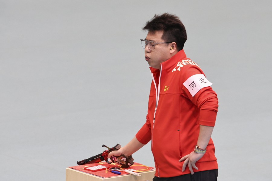 Pang Wei competes in the 10m air pistol men's team final at China's 14th National Games in Xi'an, Shaanxi Province on Sept. 14, 2021. (Xinhua/Zhang Tao)