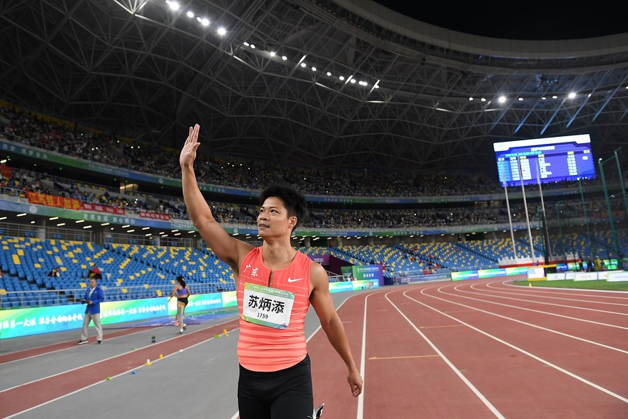 Su Bingtian waves to the audience after winning the men's 100m title at China's 14th National Games in Xi'an, Shaanxi Province on Sept. 21, 2021. (Xinhua/Li Yibo)