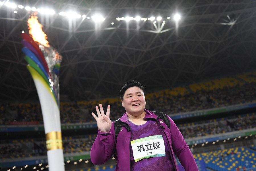 Gong Lijiao makes the gesture for her fourth title after winning the women's shot put at China's 14th National Games in Xi'an, Shaanxi Province on Sept. 20, 2021. (Xinhua/Li Yibo)