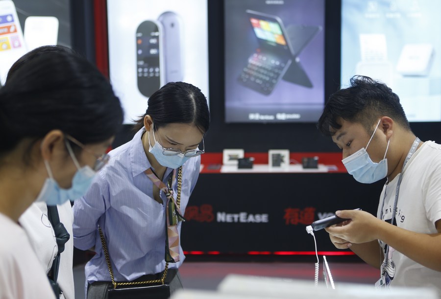 People visit the Light of Internet expo, part of the 2021 World Internet Conference Wuzhen Summit, in Wuzhen, east China's Zhejiang Province, Sept. 28, 2021 (Xinhua/Ding Hongfa)