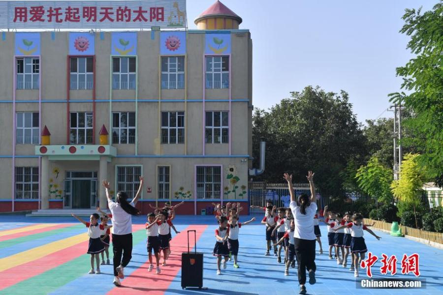 Children play games on the playground in Kumu village's kindergarten, Hotan County, China's Xinjiang Uygur Autonomous Region, Sept. 27, 2021. (China News Service/Tian Yuhao)