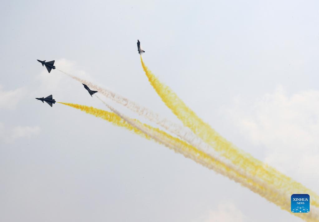China's Bayi Aerobatic Team performs during the opening ceremony of the 13th China International Aviation and Aerospace Exhibition, or Airshow China 2021, in Zhuhai, south China's Guangdong Province, Sept. 28, 2021. The exhibition kicked off on Tuesday. (Xinhua/Ju Zhenhua)