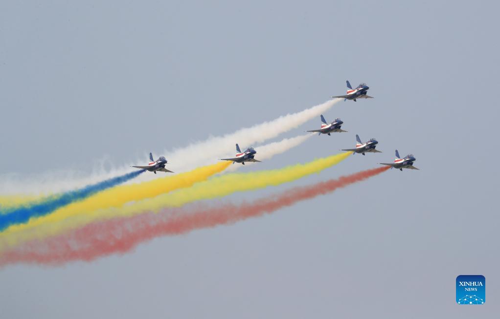 China's Bayi Aerobatic Team performs during the opening ceremony of the 13th China International Aviation and Aerospace Exhibition, or Airshow China 2021, in Zhuhai, south China's Guangdong Province, Sept. 28, 2021. The exhibition kicked off on Tuesday. (Xinhua/Ju Zhenhua)