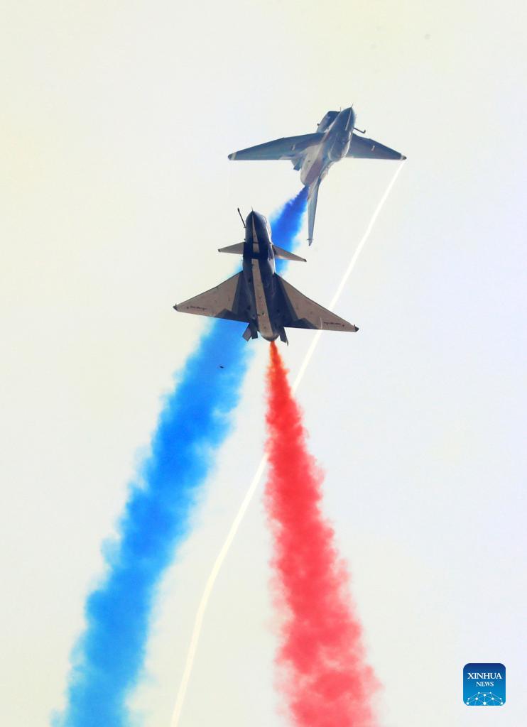 China's Bayi Aerobatic Team performs during the opening ceremony of the 13th China International Aviation and Aerospace Exhibition, or Airshow China 2021, in Zhuhai, south China's Guangdong Province, Sept. 28, 2021. The exhibition kicked off on Tuesday. (Xinhua/Ju Zhenhua)