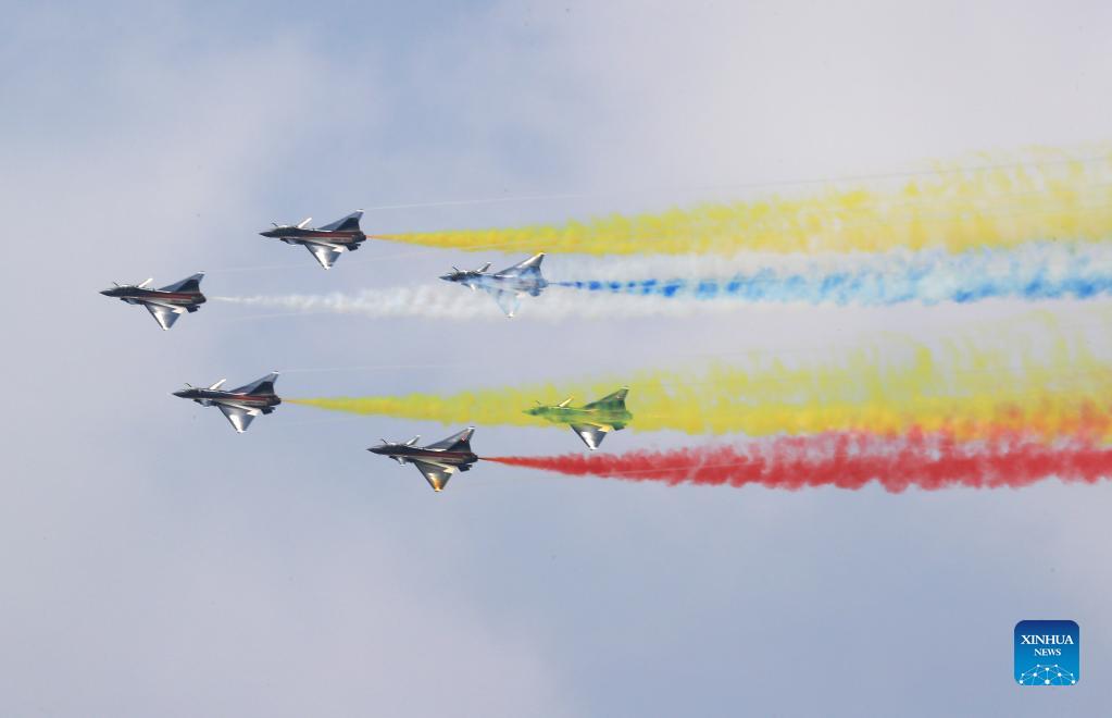 China's Bayi Aerobatic Team performs during the opening ceremony of the 13th China International Aviation and Aerospace Exhibition, or Airshow China 2021, in Zhuhai, south China's Guangdong Province, Sept. 28, 2021. The exhibition kicked off on Tuesday. (Xinhua/Ju Zhenhua)