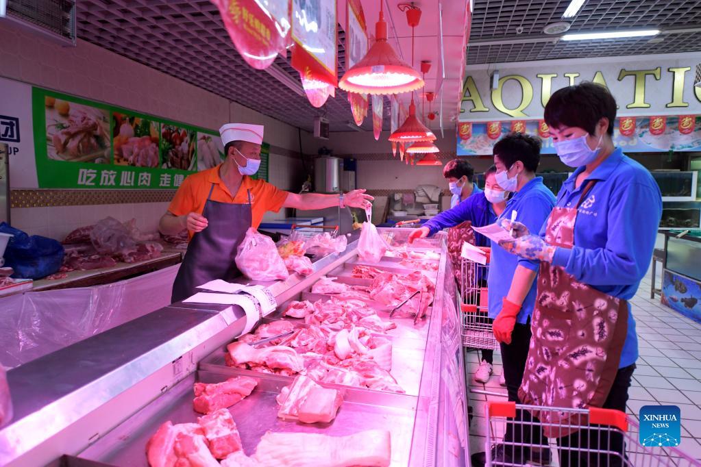 Supermarket employees prepare meat ordered online by residents under close-off management in Bayan County of Harbin, northeast China's Heilongjiang Province, Sept. 27, 2021. Local authorities have prioritized delivery services to ensure the supply of necessities for residents under close-off management. The pricing of commodities remains stable in the county. (Xinhua/Wang Jianwei)