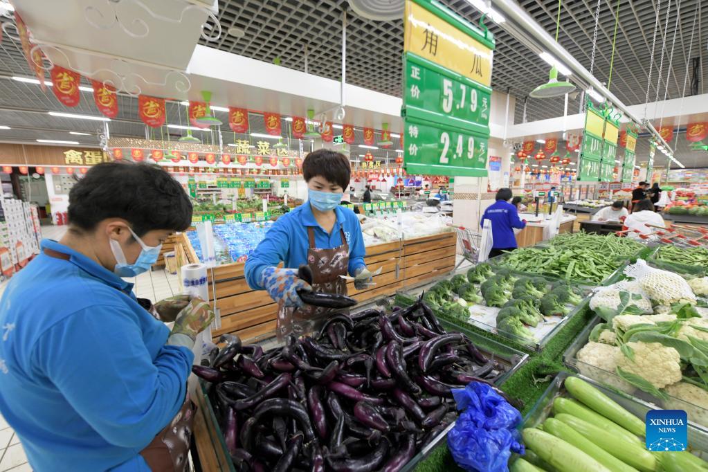Supermarket employees prepare vegetables ordered online by residents under close-off management in Bayan County of Harbin, northeast China's Heilongjiang Province, Sept. 27, 2021. Local authorities have prioritized delivery services to ensure the supply of necessities for residents under close-off management. The pricing of commodities remains stable in the county. (Xinhua/Wang Jianwei)