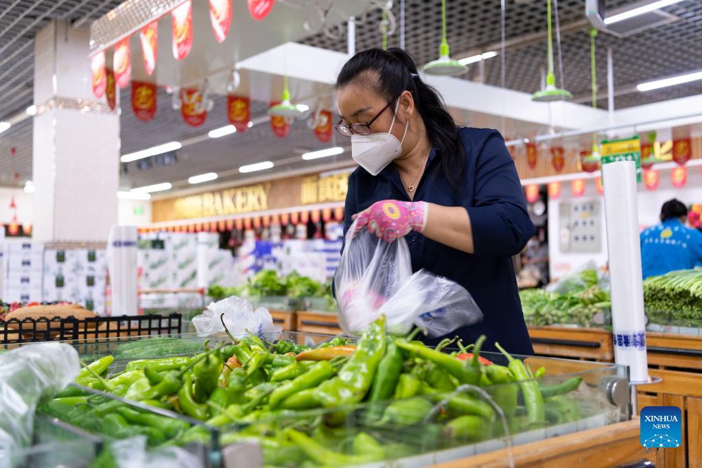 A supermarket employee selects vegetables ordered online by residents under close-off management in Bayan County of Harbin, northeast China's Heilongjiang Province, Sept. 27, 2021. Local authorities have prioritized delivery services to ensure the supply of necessities for residents under close-off management. The pricing of commodities remains stable in the county. (Xinhua/Xie Jianfei)