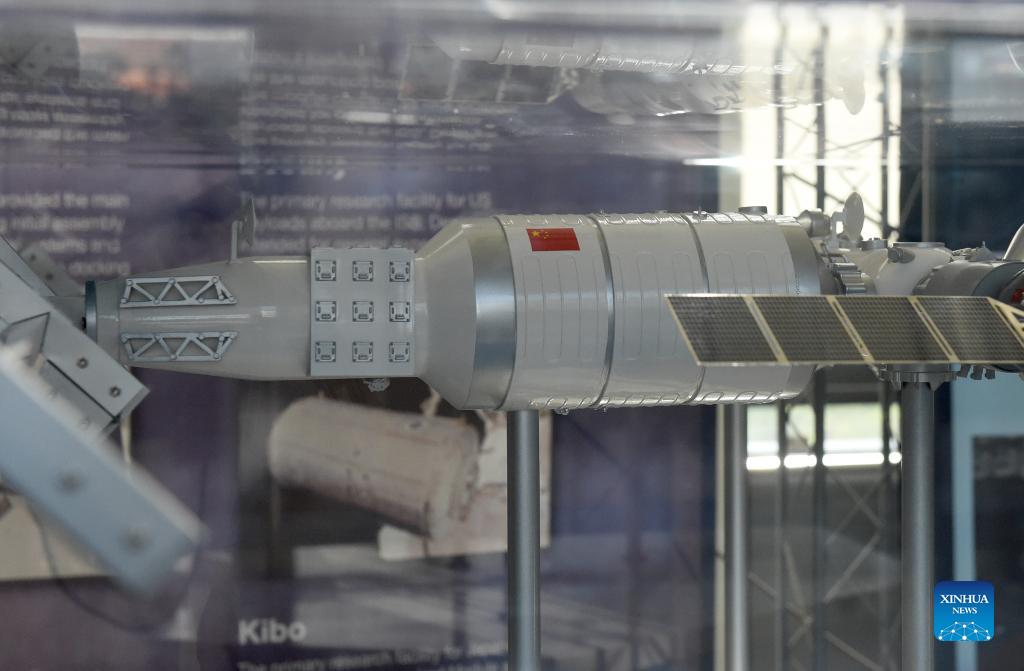 Photo taken on Sept. 28, 2021 shows a model of China's space station at the Vienna International Center in Vienna, Austria. Models of space projects from across the world including China's space station and lunar rover Yutu are displayed at the Vienna International Center. (Xinhua/Guo Chen)