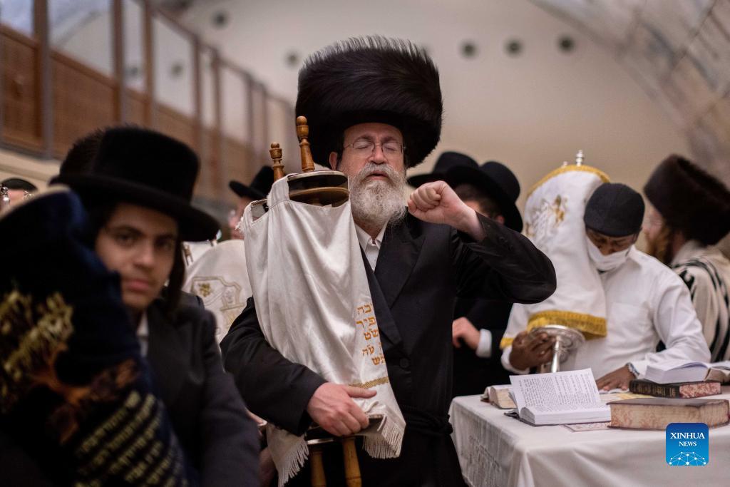 Jewish men carry Torah scrolls during Simchat Torah celebrations at the Western Wall in Jerusalem's Old City, on Sept. 28, 2021. (JINI via Xinhua)