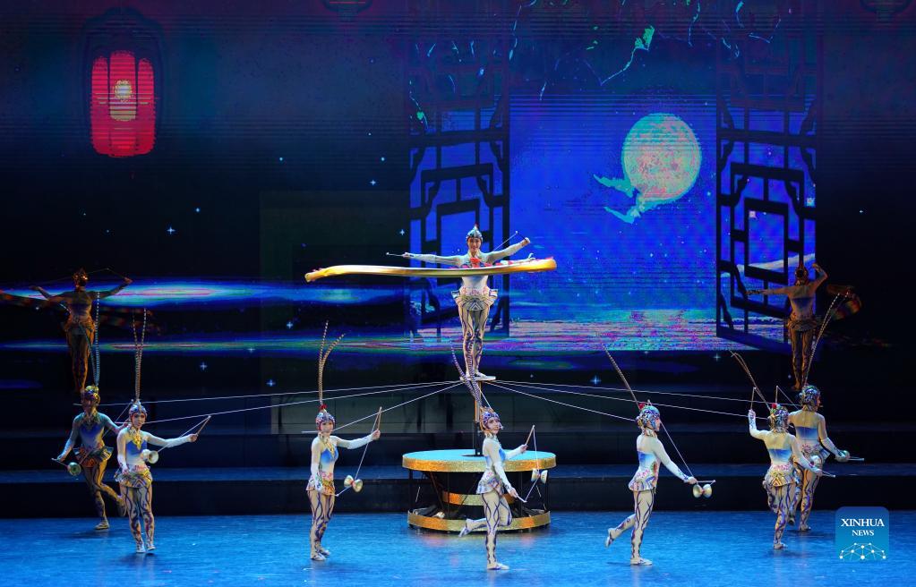 Acrobats perform at the opening ceremony of the 18th China Wuqiao International Circus Festival in Shijiazhuang, north China's Hebei Province, Sept. 28, 2021. The 18th China Wuqiao International Circus Festival kicked off Tuesday in Shijiazhuang. The three-day event will be held both online and offline in Shijiazhuang and Cangzhou of Hebei Province. (Xinhua/Mu Yu)