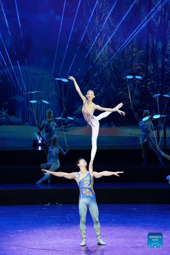 Acrobats perform at the opening ceremony of the 18th China Wuqiao International Circus Festival in Shijiazhuang, north China's Hebei Province, Sept. 28, 2021. The 18th China Wuqiao International Circus Festival kicked off Tuesday in Shijiazhuang. The three-day event will be held both online and offline in Shijiazhuang and Cangzhou of Hebei Province. (Xinhua/Mu Yu)