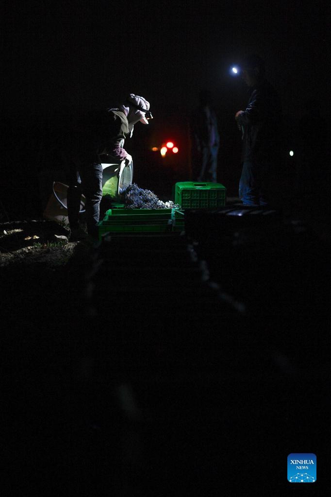 A worker pours newly-harvested grapes into boxes in Minning Township of Yongning County, northwest China's Ningxia Hui Autonomous Region, Sept. 24, 2021. At around 3 a.m., the foothills of Helan Mountain in Ningxia are illuminated by headlamps worn by farmers ready to pick grapes in the vineyards here. The low temperature at night helps retain the aroma and flavor of grapes, and therefore ensures the quality of wine. In the past, the foothills of Helan Mountain were strewn with barren lands. But now, thanks to abundant sunshine, adequate irrigation and favorable climate, the area has become a "golden zone" for the growth of wine grapes. The wine and grape industry has pillared Ningxia's sustainable economic development, providing more than 120,000 jobs. (Xinhua/Wang Peng)