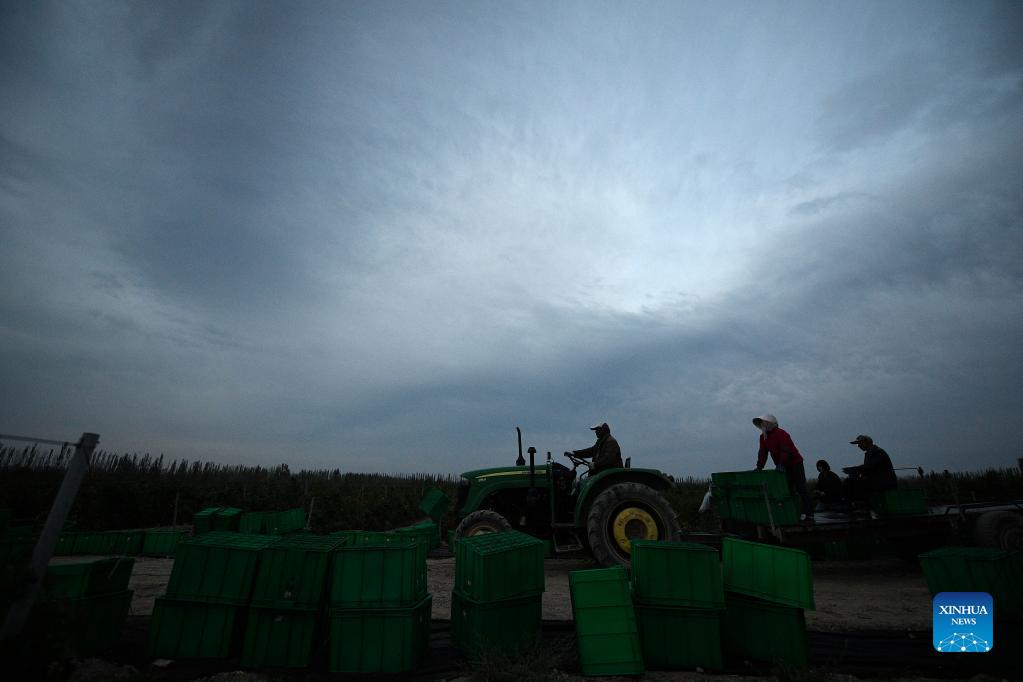 Workers take a tractor to another vineyard in Minning Township of Yongning County, northwest China's Ningxia Hui Autonomous Region, Sept. 24, 2021. At around 3 a.m., the foothills of Helan Mountain in Ningxia are illuminated by headlamps worn by farmers ready to pick grapes in the vineyards here. The low temperature at night helps retain the aroma and flavor of grapes, and therefore ensures the quality of wine. In the past, the foothills of Helan Mountain were strewn with barren lands. But now, thanks to abundant sunshine, adequate irrigation and favorable climate, the area has become a "golden zone" for the growth of wine grapes. The wine and grape industry has pillared Ningxia's sustainable economic development, providing more than 120,000 jobs. (Xinhua/Wang Peng)