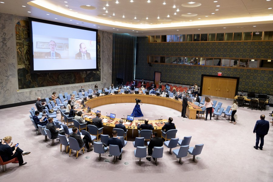 Photo taken on Aug. 24, 2021 shows a view of the Security Council meeting on the situation in Syria at the UN headquarters in New York. (Manuel Elias/UN Photo/Handout via Xinhua)