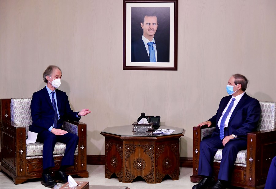 The UN envoy to Syria Geir Pedersen (L) meets with Syrian Foreign Minister Faisal Mekdad in Damascus, Syria, on Feb. 22, 2021. (Photo by Ammar Safarjalani/Xinhua)