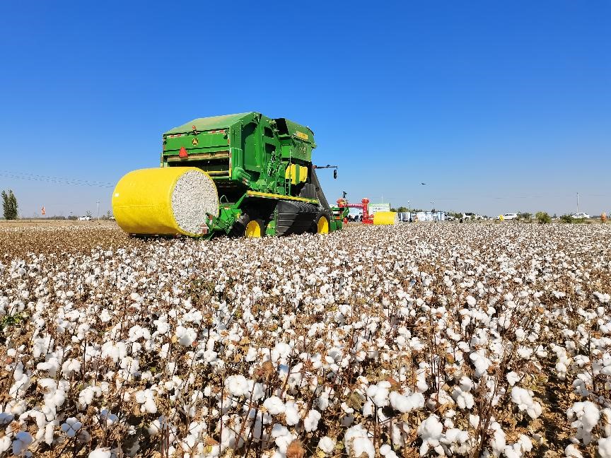 A cotton picker is picking cotton in a field in Shawan, Tacheng prefecture, Xinjiang Uygur autonomous region, Sept. 26, 2021. (People's Daily Online/Wang Fangji) |