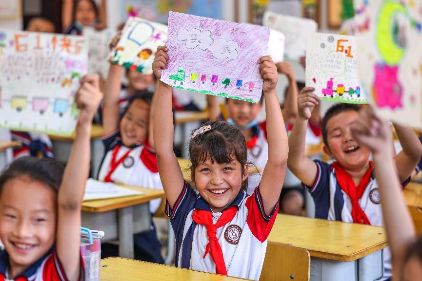 Students from a primary school in Kuqa, Xinjiang Uygur autonomous region showcase the greeting cards they have made for the Children's Day, May 28, 2021. (People's Daily Online/Yuan Huanhuan) |
