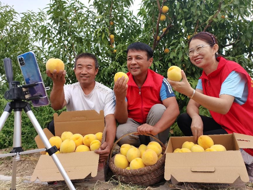 Cadres dispatched to Gudao village, Shawan, Xinjiang Uygur autonomous region, joins a livestream marketing activity with local farmers, Sept. 1, 2021. (People's Daily Online/Lan Ling) |