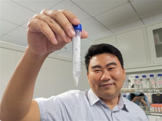 Cai Tao, an associate research fellow at the Tianjin Institute of Industrial Biotechnology, Chinese Academy of Sciences, shows starch synthesized at a lab. (Photo/China Science Daily)