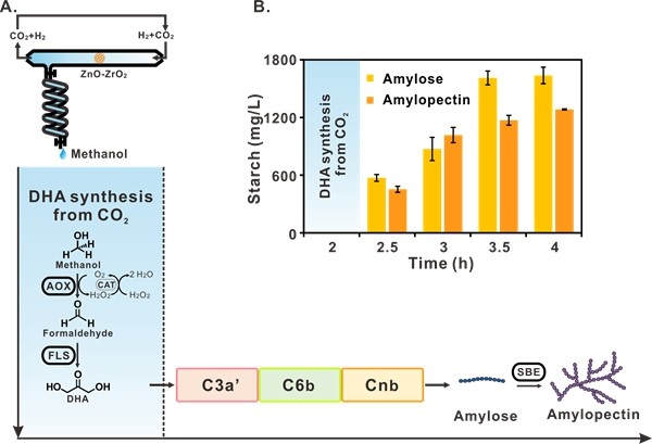 Researchers at the TIIB have pioneered a pathway to artificial synthesis of starch from CO2 and hydrogen produced through electrolysis of water. Consisting of 11 core biochemical reactions, the pathway is about 8.5 times faster than corn in producing starch.