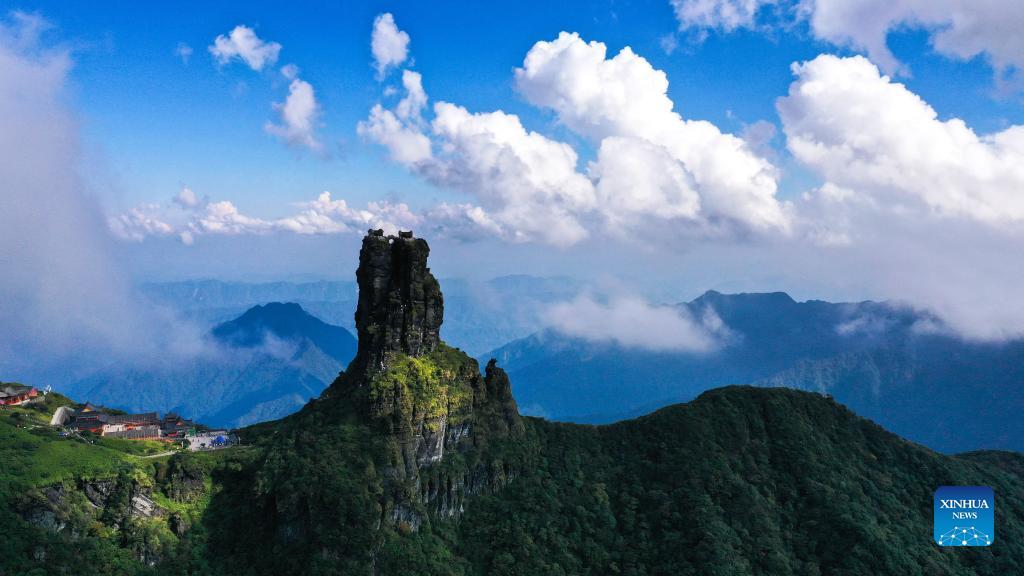 Aerial photo taken on Sept. 27, 2021 shows a view of Mount Fanjing in Tongren City, southwest China's Guizhou Province. Boasting rich natural resources and high vegetation coverage, Mount Fanjing was listed as a UNESCO World Natural Heritage Site in 2018. (Xinhua/Yang Wenbin)