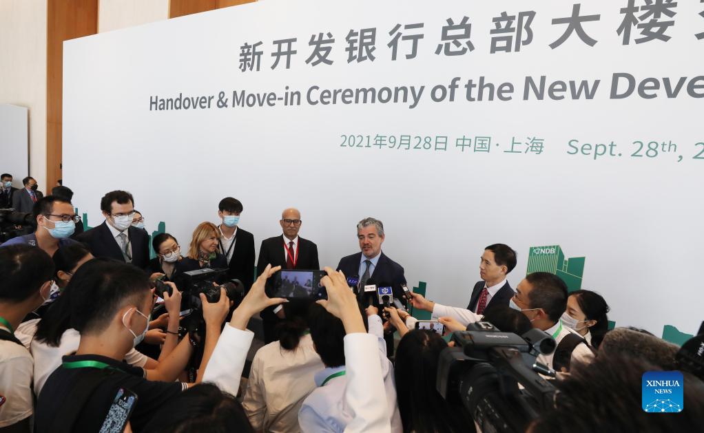 Marcos Troyjo, president of the New Development Bank (NDB), speaks to the press after a handover &move-in ceremony of the NDB headquarters building in Shanghai, east China, Sept. 28, 2021. (Xinhua/Fang Zhe)