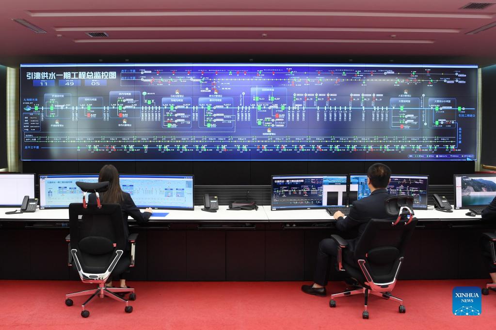 Staff members work in a control center of a water diversion project designed to deliver water from the Taohe River, a major tributary of the Yellow River, to areas suffering severe water shortages in the central part of Gansu, in northwest China's Gansu Province, Sept. 6, 2021. A major water diversion project in Gansu has been completed as the second phase of the project began supplying water Tuesday. The project is expected to alleviate water shortages for more than six million people in the province, local authorities said Tuesday. (Xinhua/Fan Peishen)