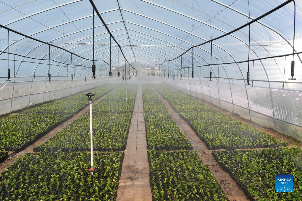 Spray irrigation is employed in a greenhouse at a poverty-relief industrial park in Lujiagou Township of Dingxi, northwest China's Gansu Province, Sept. 7, 2021. A major water diversion project in Gansu has been completed as the second phase of the project began supplying water Tuesday. The project is expected to alleviate water shortages for more than six million people in the province, local authorities said Tuesday. (Xinhua/Fan Peishen)
