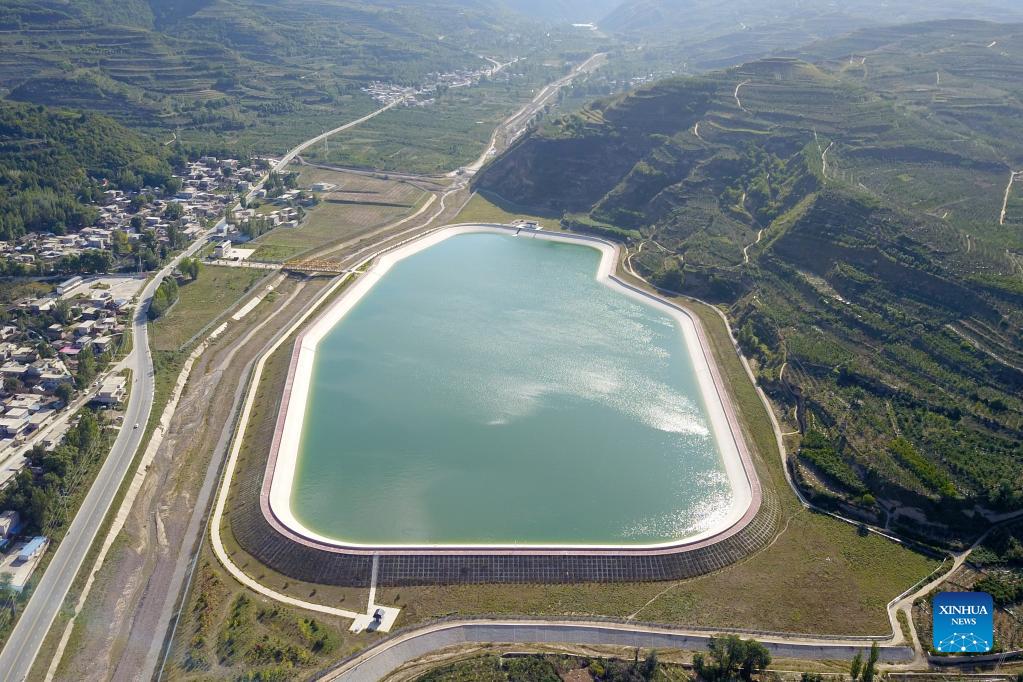 Aerial photo taken on Sept. 8, 2021 shows a reservoir for a water diversion project designed to deliver water from the Taohe River, a major tributary of the Yellow River, to areas suffering severe water shortages in the central part of Gansu, in Tianshui, northwest China's Gansu Province. A major water diversion project in Gansu has been completed as the second phase of the project began supplying water Tuesday. The project is expected to alleviate water shortages for more than six million people in the province, local authorities said Tuesday. (Xinhua/Fan Peishen)