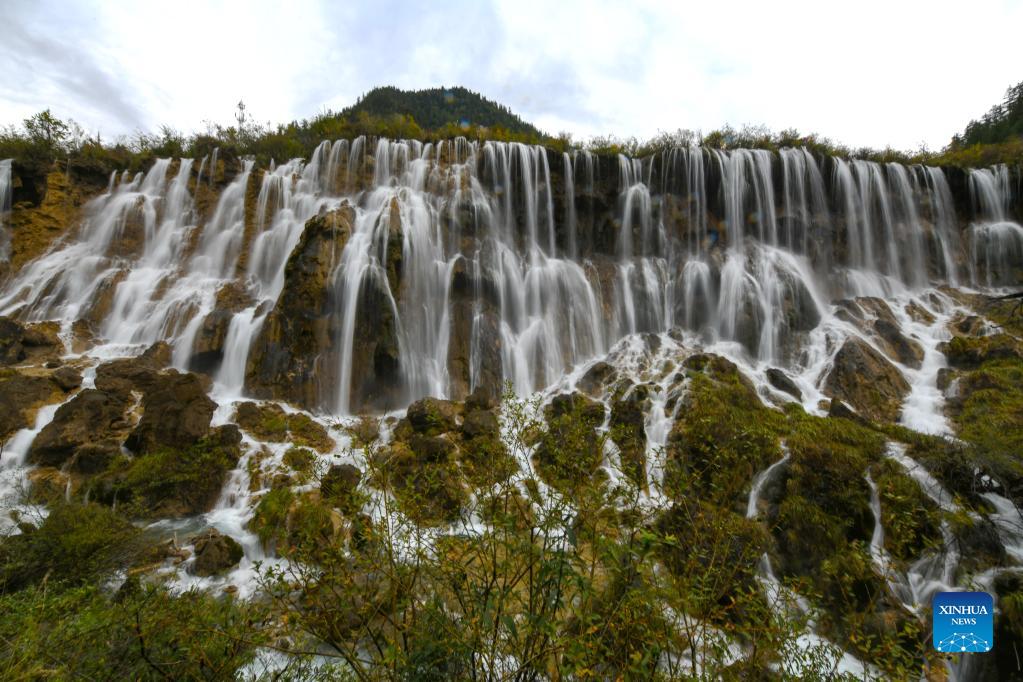 Photo taken on Sept. 27, 2021 shows a waterfall at the Jiuzhaigou scenic spot in Jiuzhaigou County, southwest China's Sichuan Province. Jiuzhaigou, a famous scenic spot in Sichuan Province, fully reopened to visitors on Tuesday. On Aug. 8, 2017, a 7.0-magnitude quake forced the closure of the Jiuzhaigou National Park, a UNESCO World Heritage site famous for its spectacular waterfalls, lush forests, and serene plateau lakes. More than 270,000 trees have been planted over the past three years, and 172 hectares of ecological habitat repaired and restored in Jiuzhaigou. The damaged mountains and vegetation have also rapidly recovered. The ecosystem was effectively restored. (Xinhua/Tang Wenhao)
