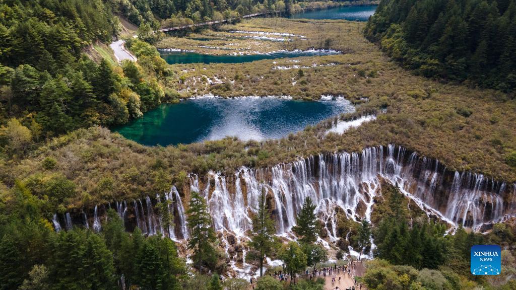 Aerial photo taken on Sept. 27, 2021 shows a waterfall at the Jiuzhaigou scenic spot in Jiuzhaigou County, southwest China's Sichuan Province. Jiuzhaigou, a famous scenic spot in Sichuan Province, fully reopened to visitors on Tuesday. On Aug. 8, 2017, a 7.0-magnitude quake forced the closure of the Jiuzhaigou National Park, a UNESCO World Heritage site famous for its spectacular waterfalls, lush forests, and serene plateau lakes. More than 270,000 trees have been planted over the past three years, and 172 hectares of ecological habitat repaired and restored in Jiuzhaigou. The damaged mountains and vegetation have also rapidly recovered. The ecosystem was effectively restored. (Xinhua/Tang Wenhao)