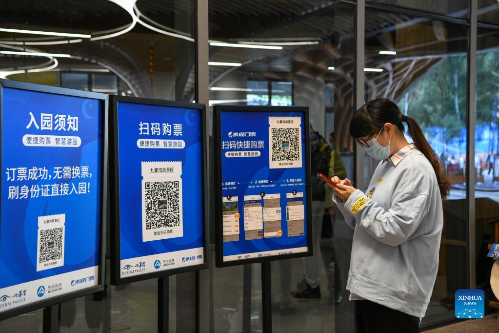A tourist purchases a ticket by scanning a QR code at the Jiuzhaigou scenic spot in Jiuzhaigou County, southwest China's Sichuan Province, Sept. 28, 2021. Jiuzhaigou, a famous scenic spot in Sichuan Province, fully reopened to visitors on Tuesday. On Aug. 8, 2017, a 7.0-magnitude quake forced the closure of the Jiuzhaigou National Park, a UNESCO World Heritage site famous for its spectacular waterfalls, lush forests, and serene plateau lakes. More than 270,000 trees have been planted over the past three years, and 172 hectares of ecological habitat repaired and restored in Jiuzhaigou. The damaged mountains and vegetation have also rapidly recovered. The ecosystem was effectively restored. (Xinhua/Tang Wenhao)
